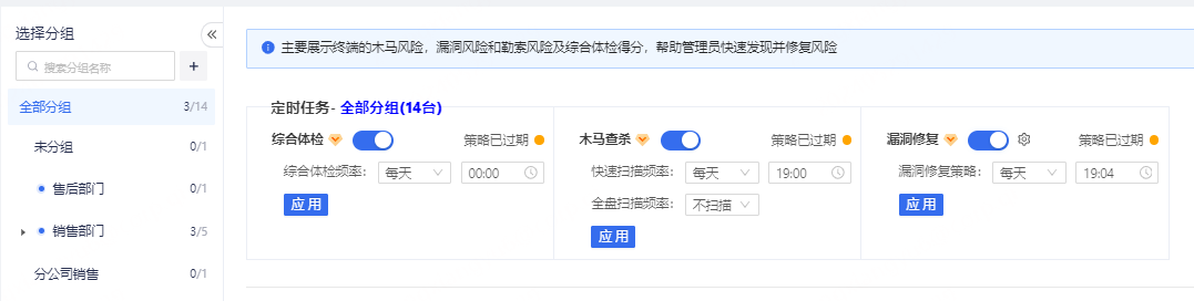 同时可对分组进行定时体检、定时木马查杀和定时漏洞修复的设置(专业安全管理运维服务)