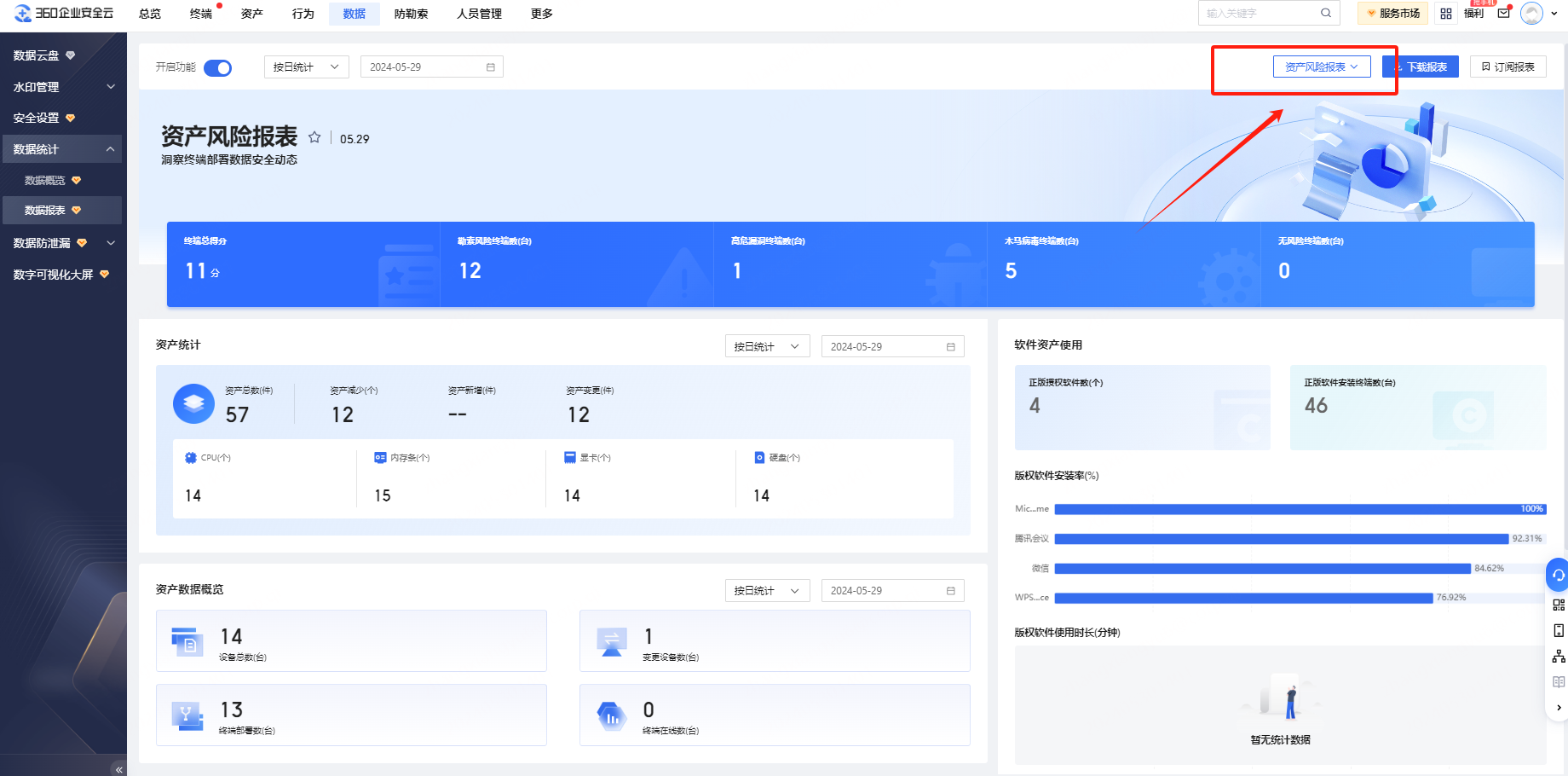 资产风险模板,展示全局终端软件、硬件资产数据动态