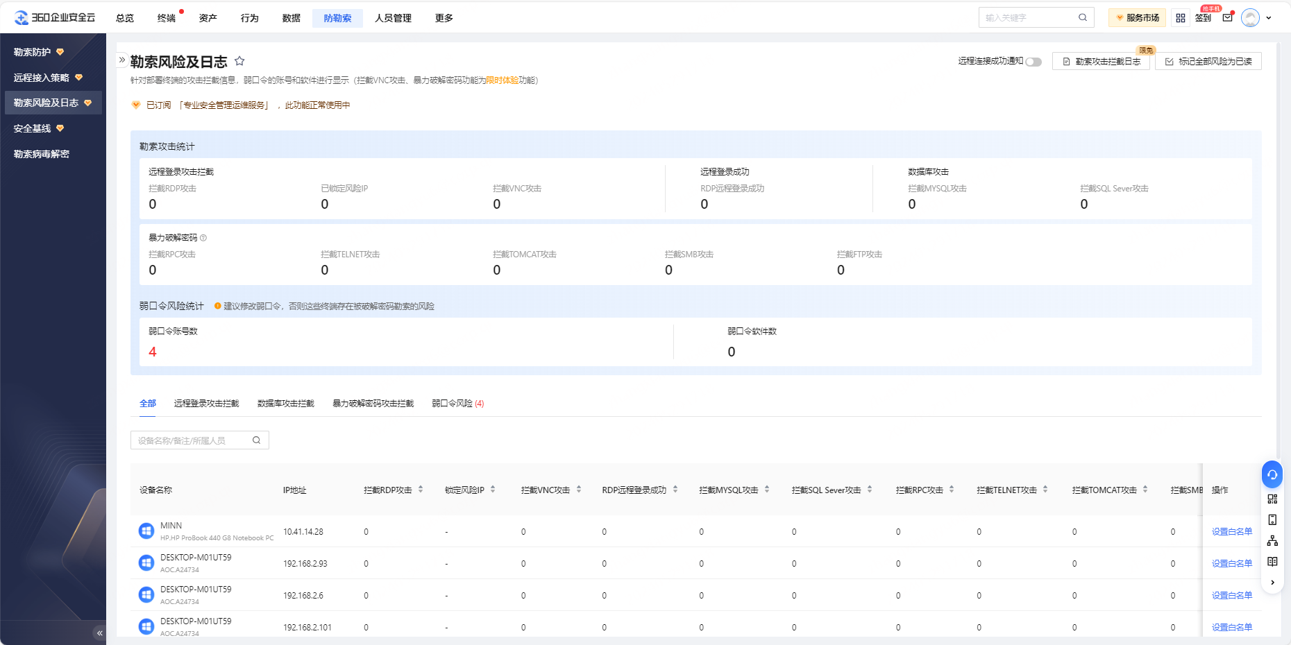 针对团队内终端的攻击拦截信息、弱口令的账号和软件进行显示。